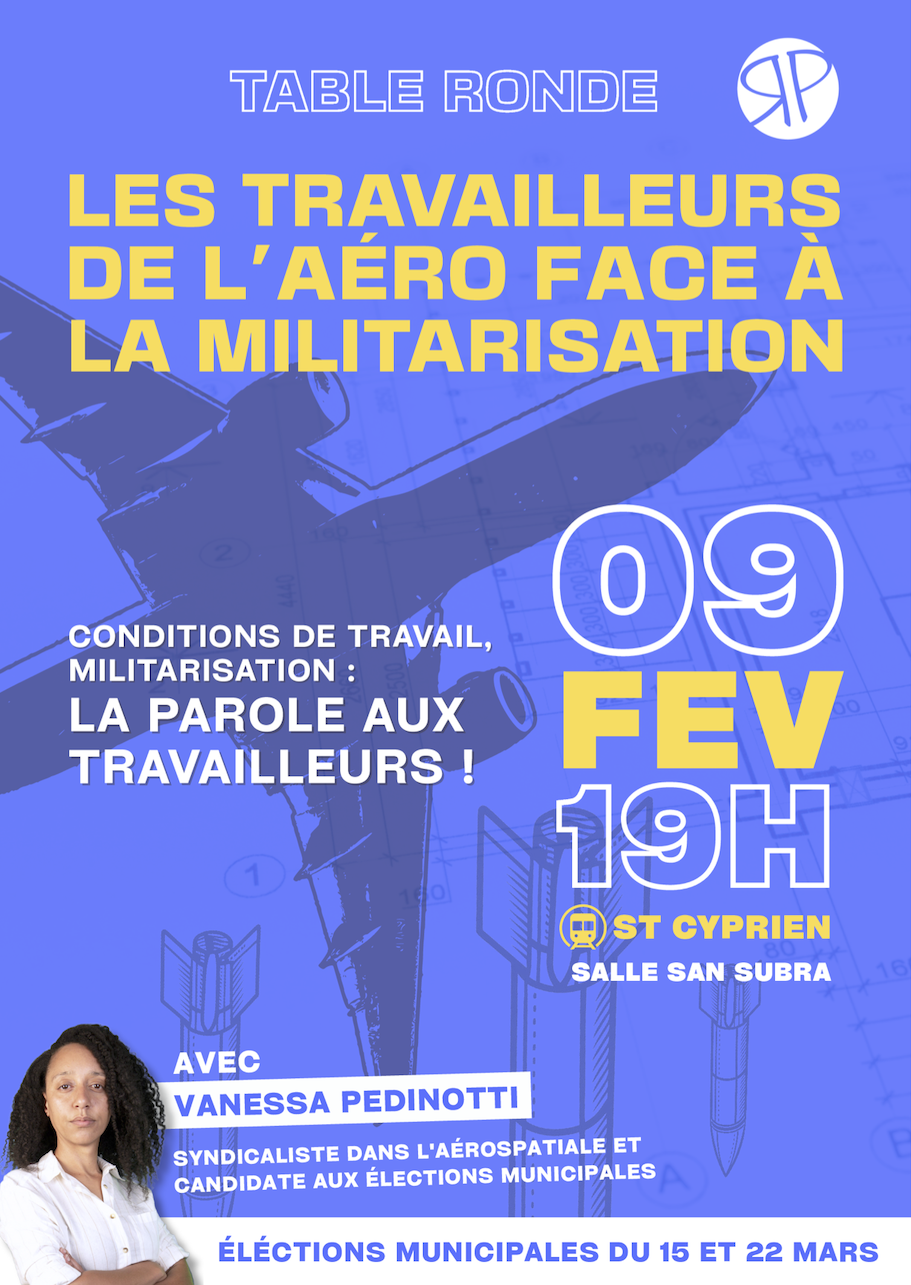 Dans le cadre des élections municipales de Toulouse, Révolution Permanente organise un débat avec des travailleurs de l’aéro lundi 9 février, en présence de Vanessa Pedinotti . Une occasion d’aborder les conditions de travail du secteur, son rôle dans la militarisation et le programme à défendre pour les travailleurs
